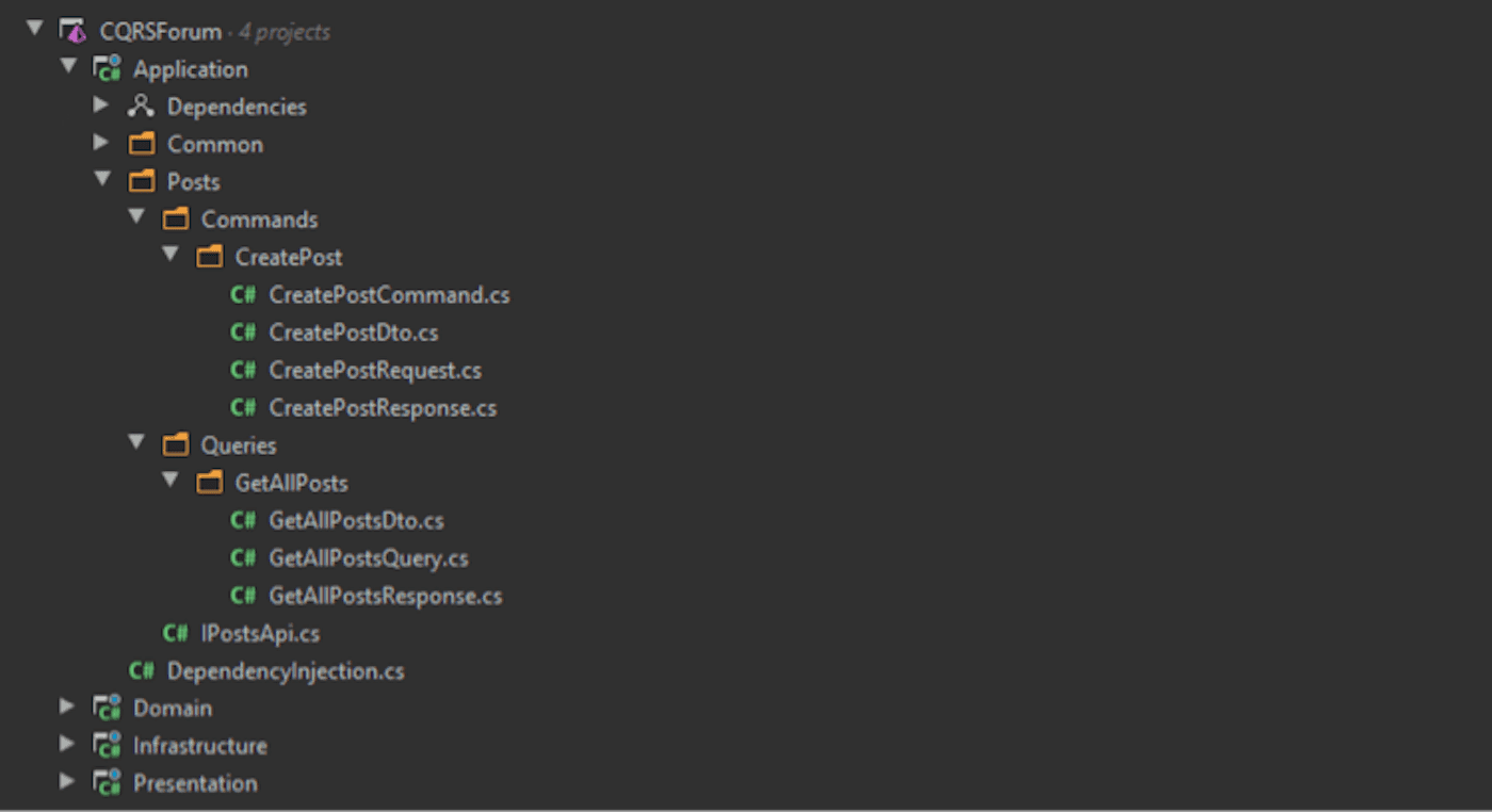 Together with the Domain layer, the Application layer forms up a Core of the solution which should be able to operate and provide business logic independently from outer layers and depend solely upon the Domain layer. It contains all of the good stuff such as the business logic (use cases), DTO’s, interfaces, and all of the CQRS stuff that we will be discussing later.