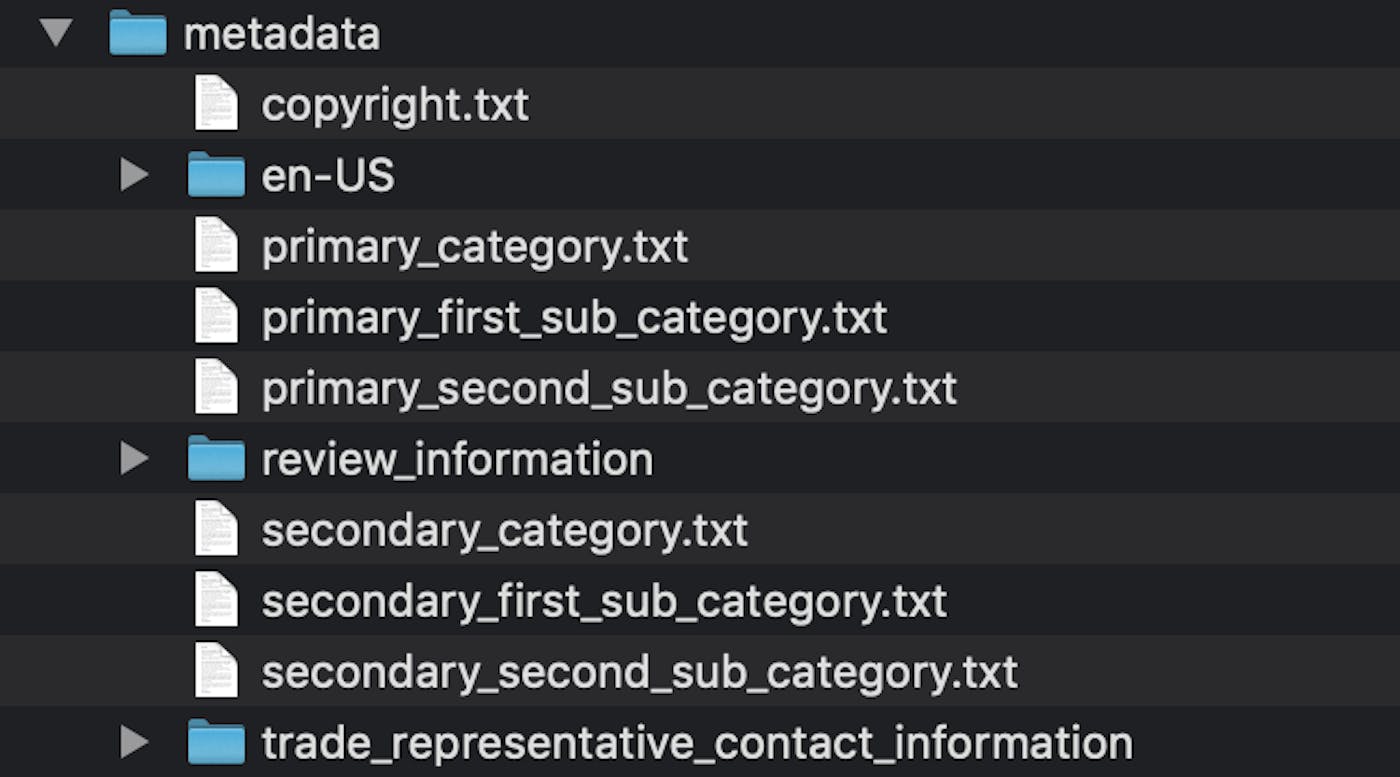 The purpose of initializing the Deliver file is so that we can input all of the required metadata and screenshots locally, before submitting it to the App Store. This will then greatly help automate the process. Here is how the new metadata folder is structured: