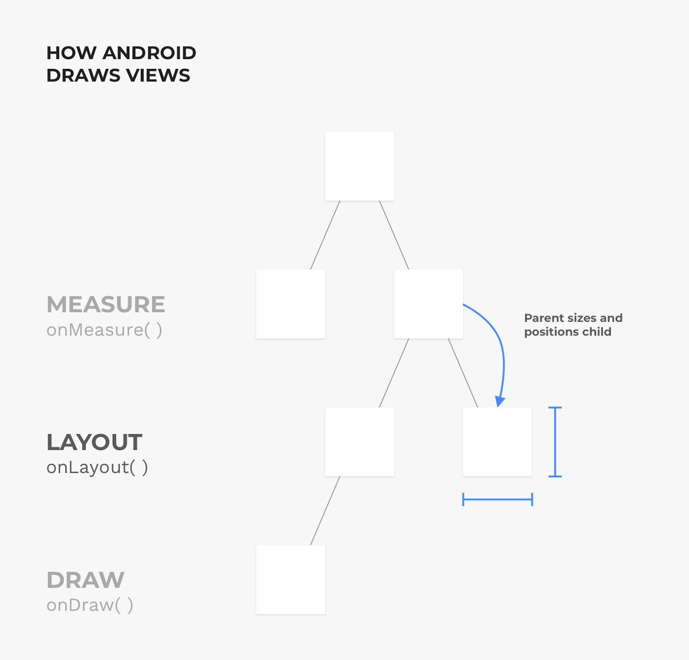 The next and final phase is the layout phase. In this phase, the parent calls the child.layout() and sets the final size and position of the child. When implementing your custom View, you should only override the onLayout() method if your View has other subviews.