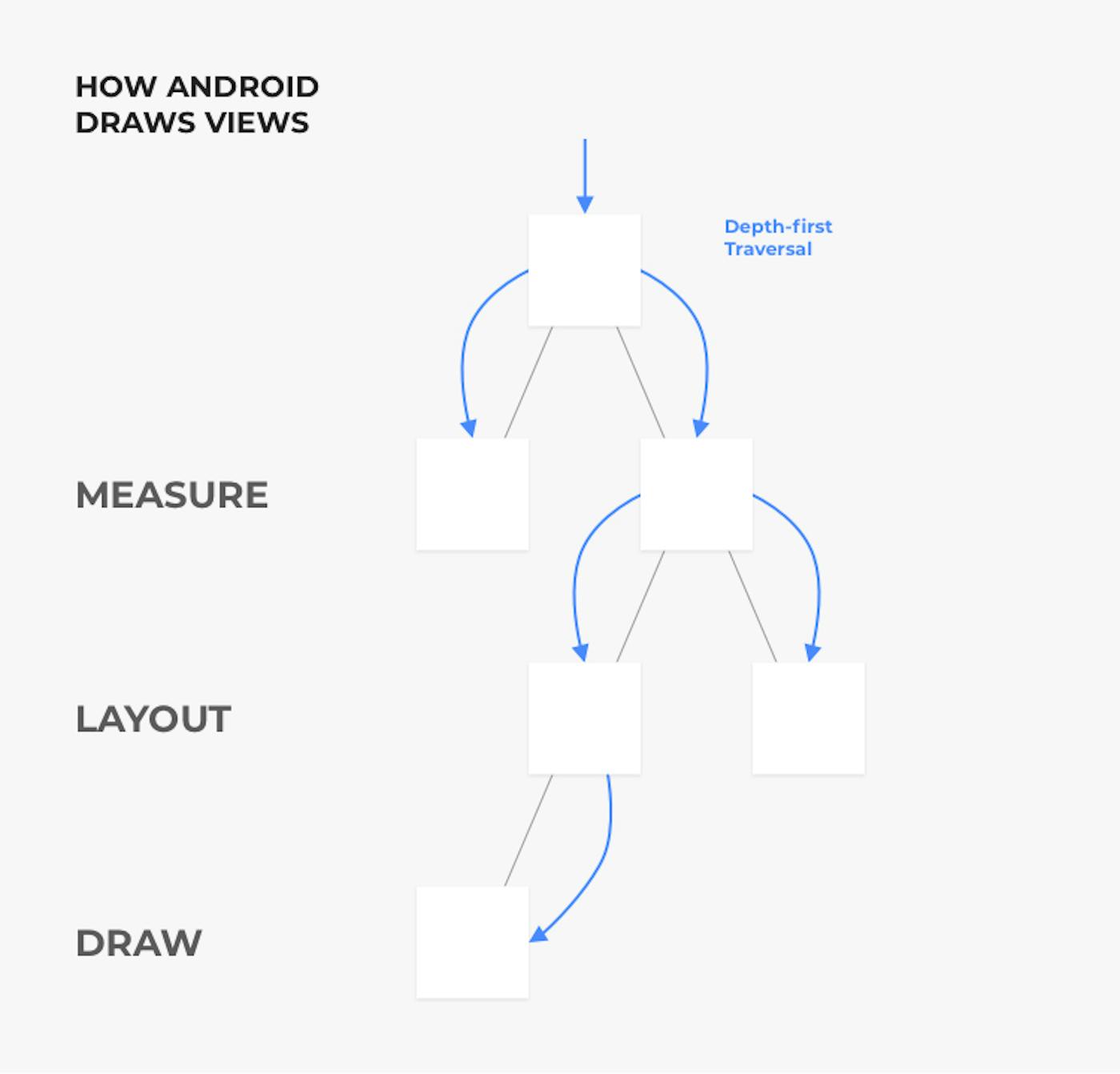 Let’s talk about how Android draws the Views. To begin, there are three phases that have to happen before the View ends up on the screen. These three phases are measure, layout, and draw. Each of these phases is the depth-first traversal of the View hierarchy going from parent to children. For each phase, there is a method that we can override and change, depending on our needs. The methods are onMeasure(), onLayout() and onDraw().