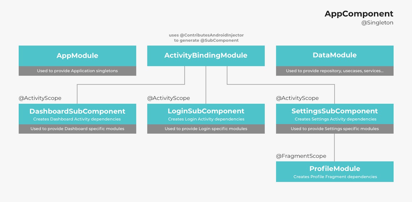 SubComponents. Inside it we have multiple @ContributedAndroidInjector annotations which create multiple activity-levelSubComponents(hence annotation @ActivityScope).