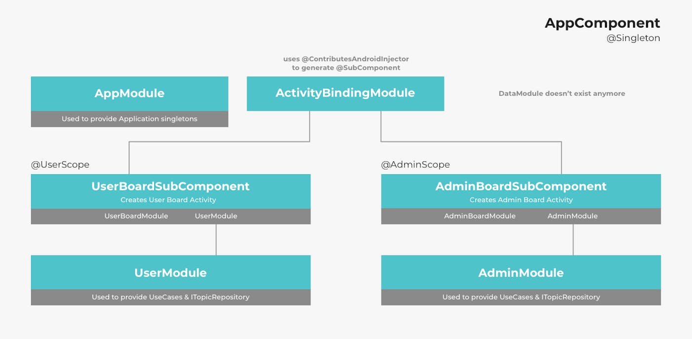 Our ActivityBindingModule now produces SubComponents annotated with different levels of User Scopes in favour of the nesting-level scope. However, our SubComponents now have dependency on {Scope}Module and Activity/FragmentModule. {Scope}Module is the one who holds different implementations of Repository.