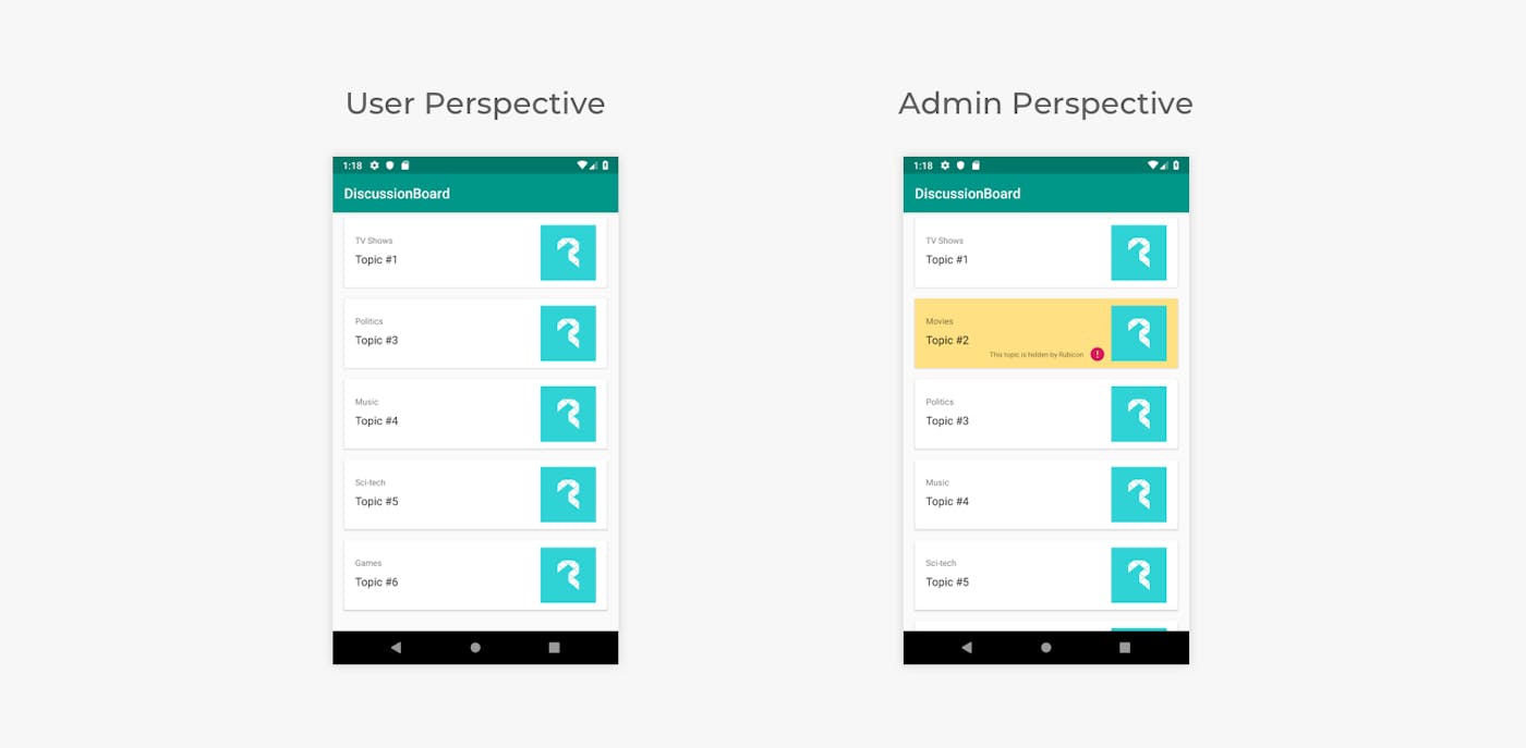 For example, if you are a simple user then you will see the topics as you normally would. However, if you are a user with higher privileges, you will see all of the topics even including the hidden ones. Basically, the idea behind this is to provide different dependencies for different user roles without changing the UI or your Domain Logic.