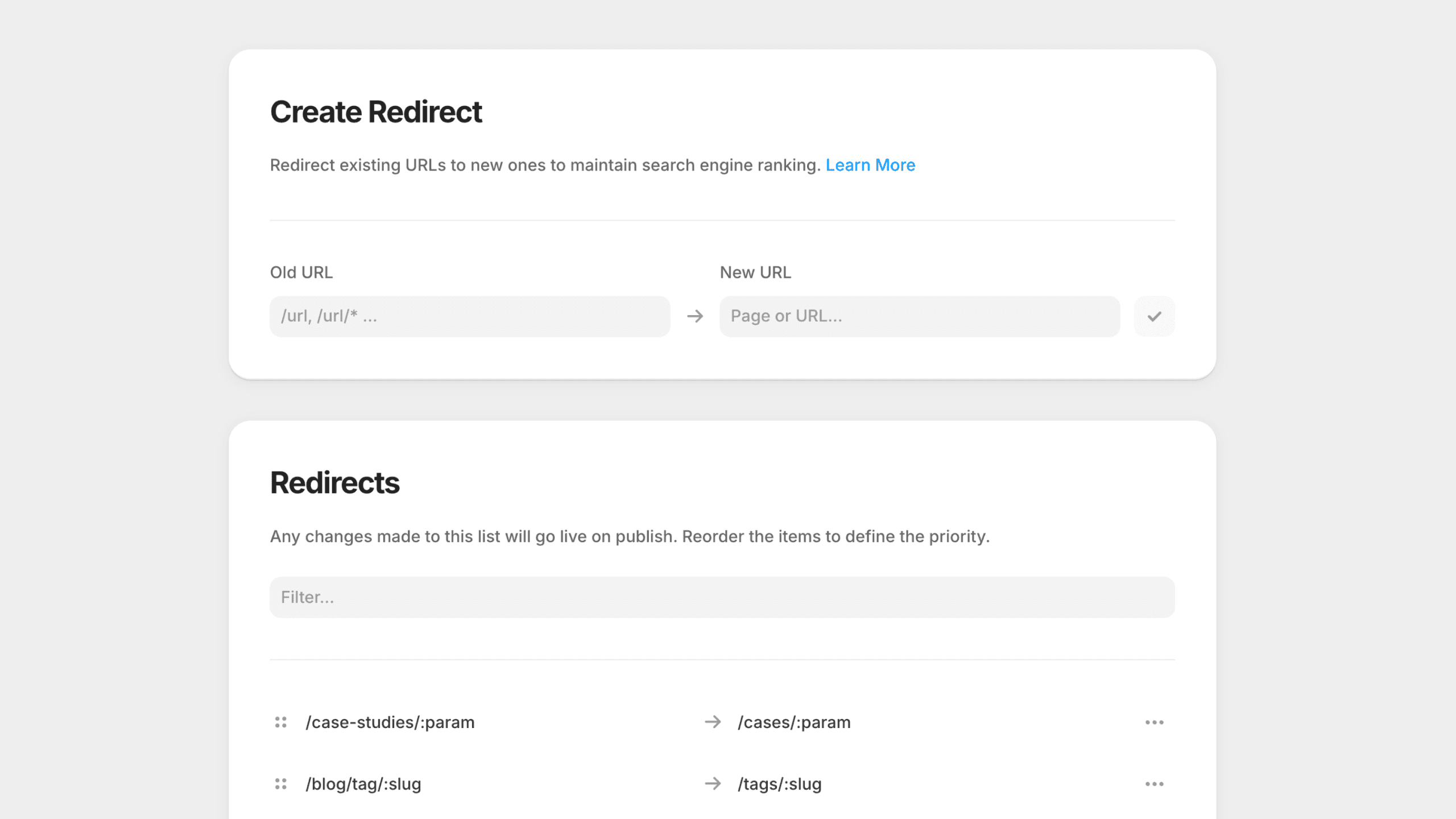 The setup was straightforward. A flat list of from and to paths in Framer's project settings. For sites with a large number of redirects, you can prepare the mapping in a spreadsheet and add them in bulk. We verified every redirect with a crawler after launch to make sure nothing slipped through.