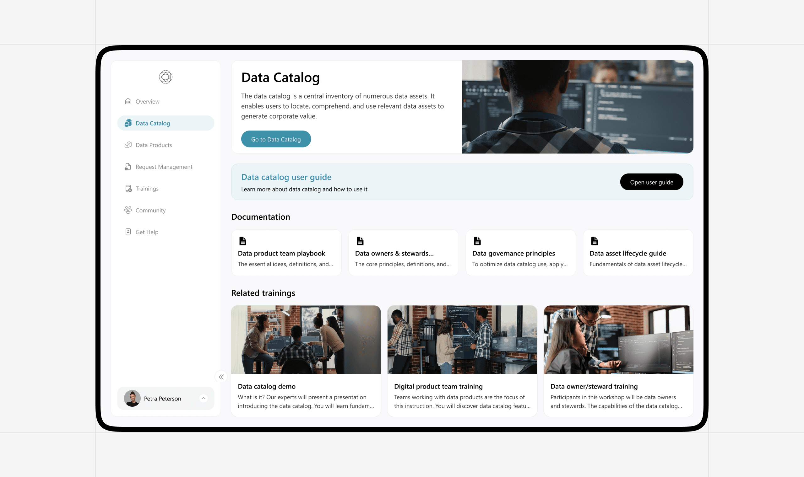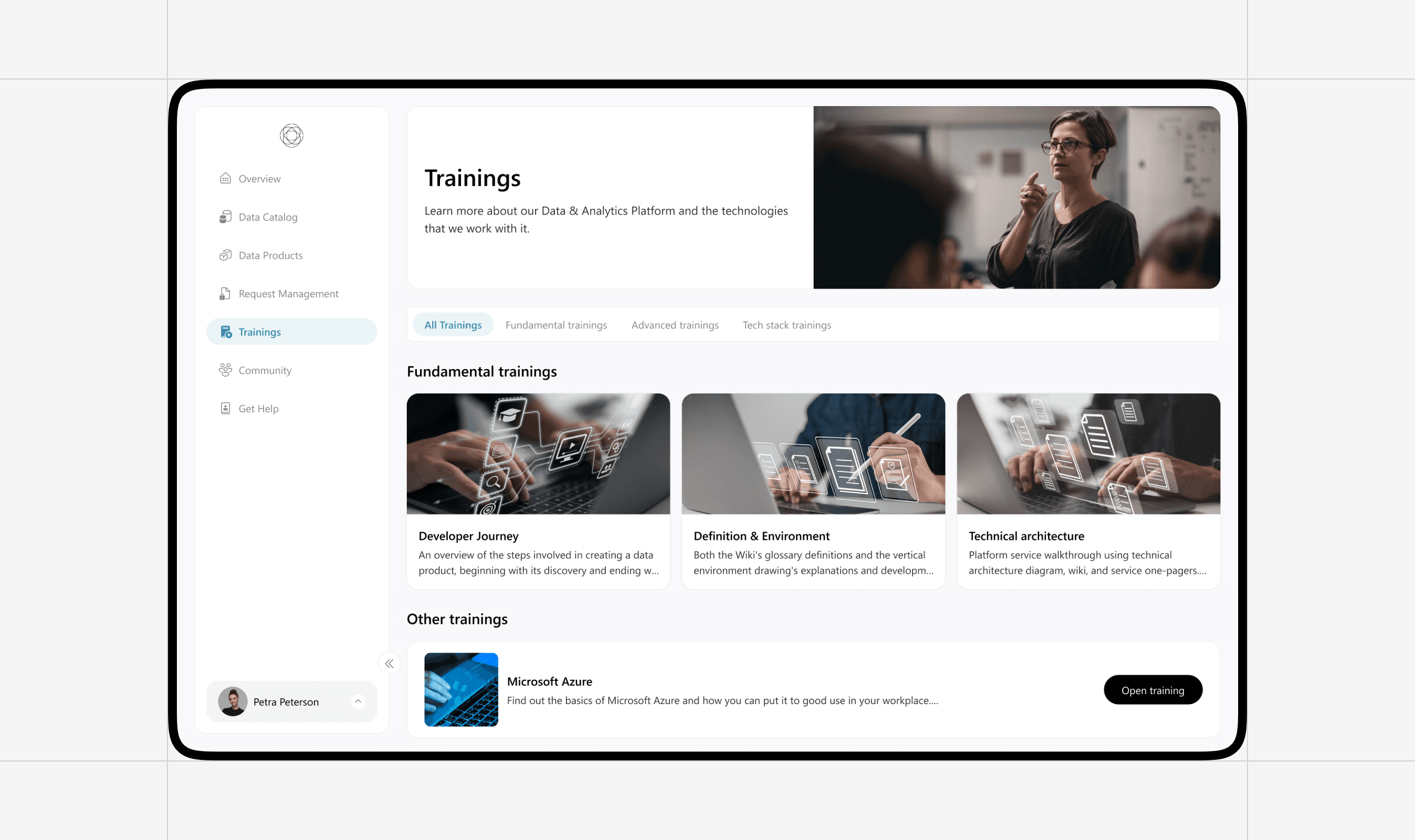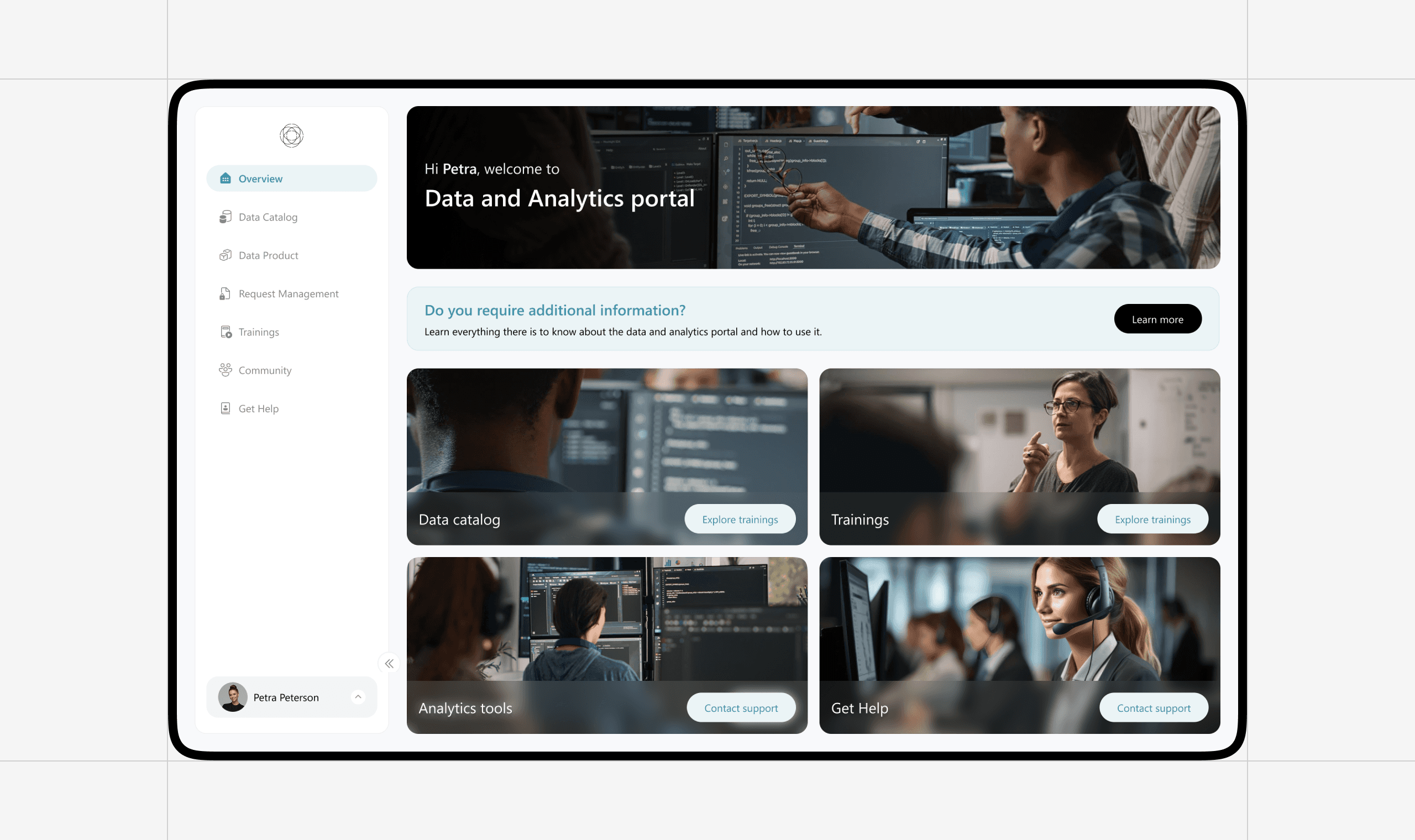 The initial Data and Analytics portal launch included the provision of a web interface with functionalities designed for user self-service. We introduced features with a simple and modern UX/UI design, allowing users to access training resources on data and analytics, learn how to utilize analytics tools, and connect with the central data catalog system. The team also delivered a scalable content management system, allowing portal administrators to manage content efficiently and publish up-to-date information visible to end-users.