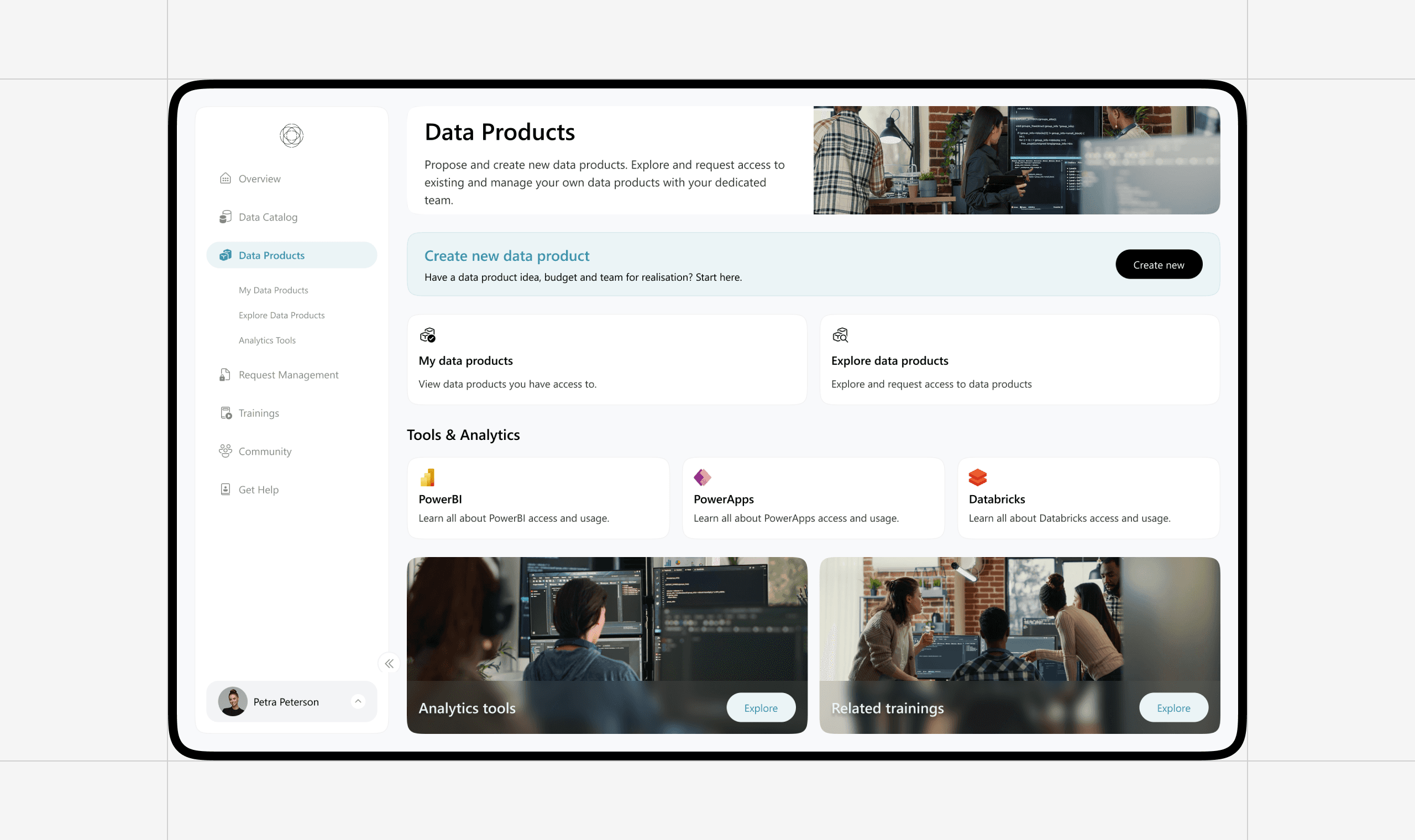 Implementing a cloud-native solution that enables users to discover data products, browse data assets, request access to relevant resources and analytics tools, and engage in various learning courses