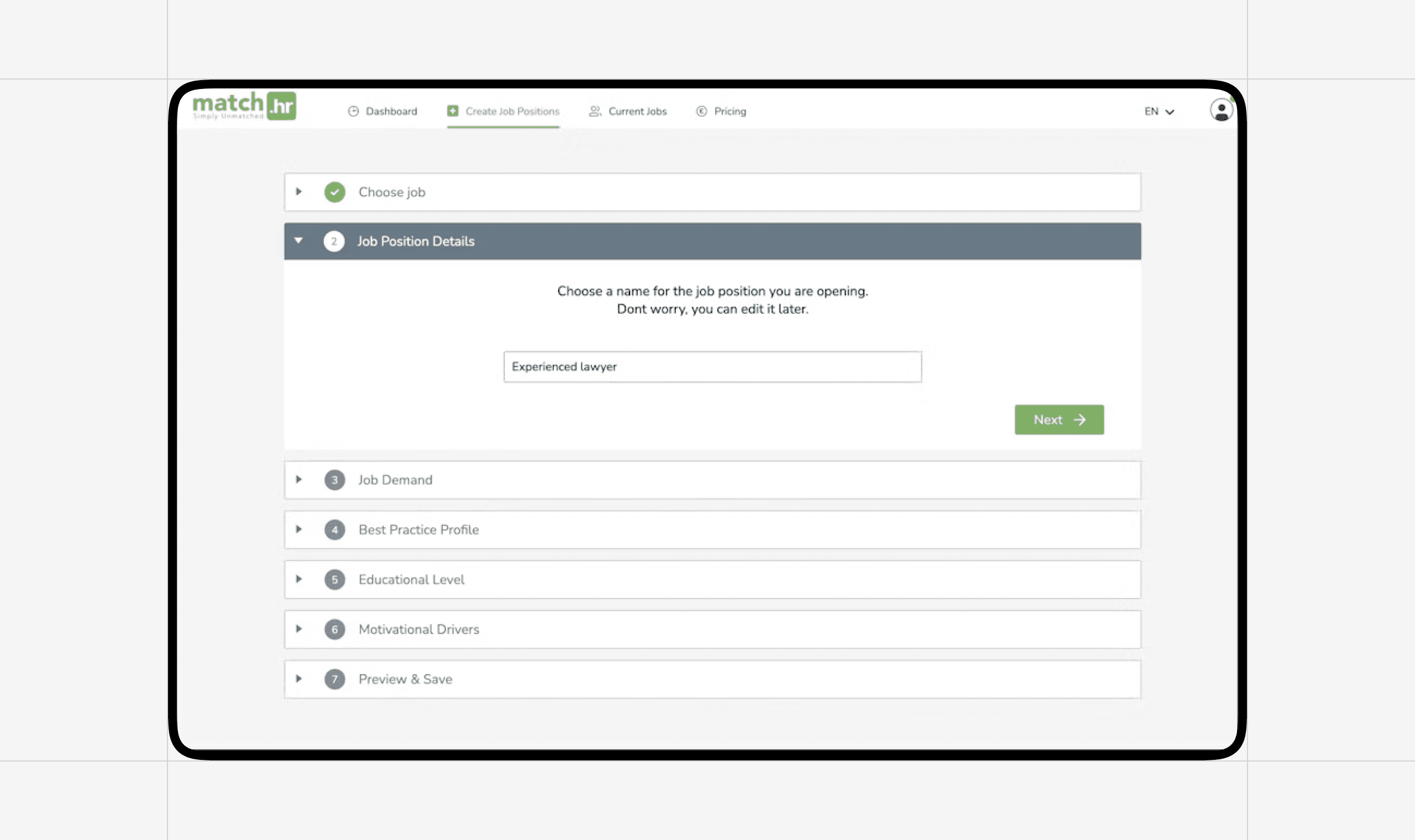Once purchasing a plan, the HR professional creates a job opening for the specific role they are looking to fill. The job opening consists of job position details, job demand, a best practice profile, education level, and motivational drivers. Once the job position is complete, the HR professional can send an assessment to the candidate for them to complete the tests that will qualify them for the job.